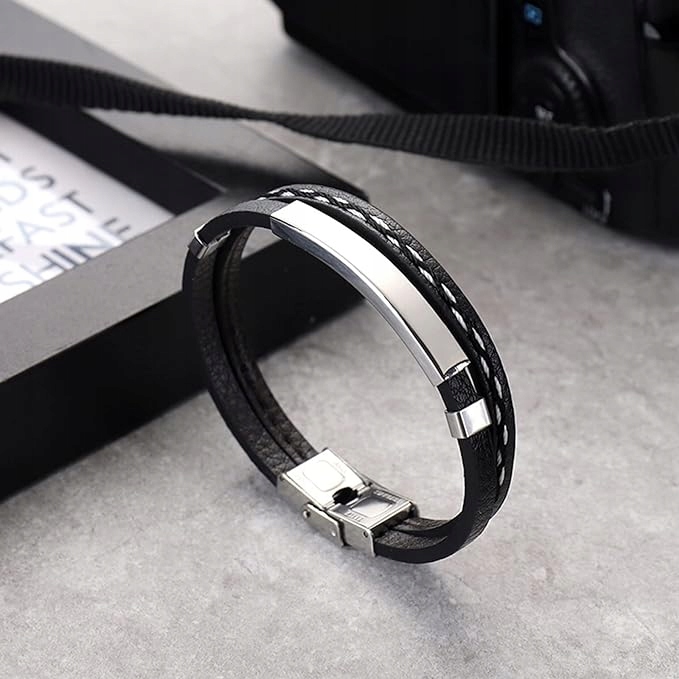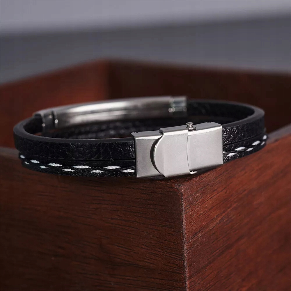 Bransoletka Męska Skórzana Czarna Stal z Grawerem Regulowana Srebrna