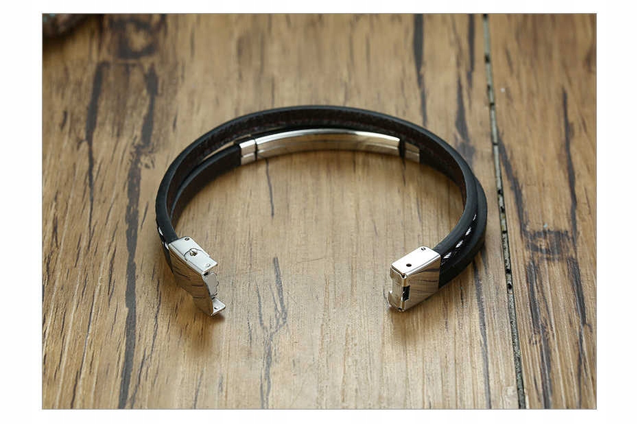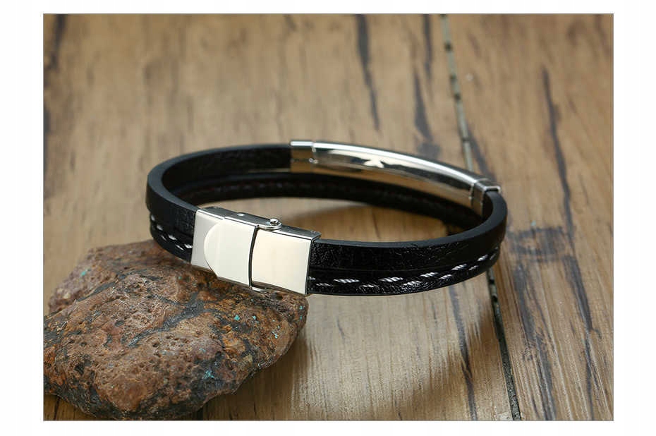 8 opinii dla Bransoletka Męska Skórzana Czarna Stal z Grawerem Regulowana Srebrna