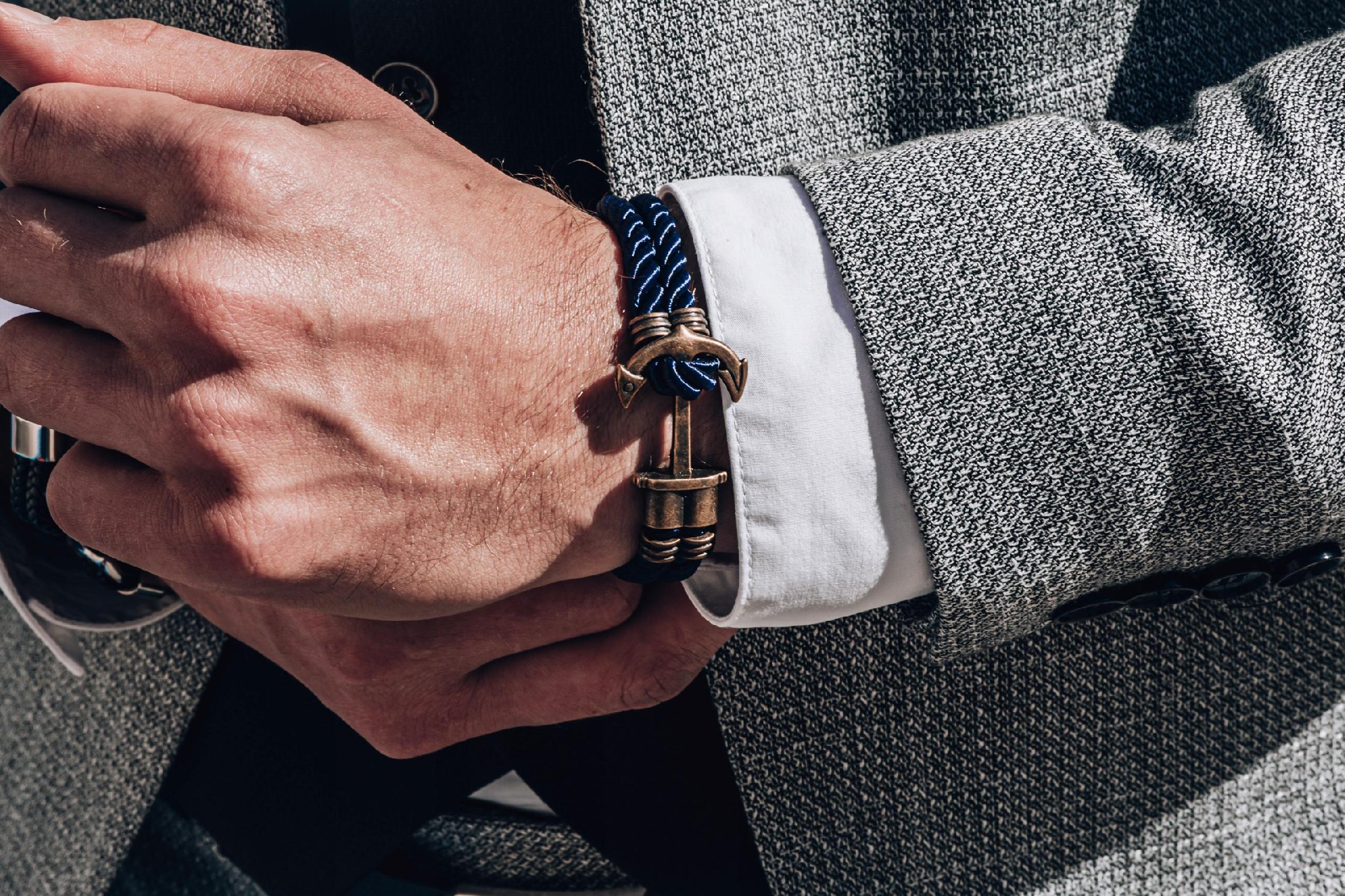 Elegancka bransoletka męska z plecionych nylonowych nici w kolorze granatowym, z metalową kotwicą, zaprojektowana specjalnie dla marki LUXMEN® we Włoszech. Jest to idealny wybór dla mężczyzn, którzy poszukują wyjątkowego akcentu do swoich codziennych stylizacji lub eleganckich outfitów.