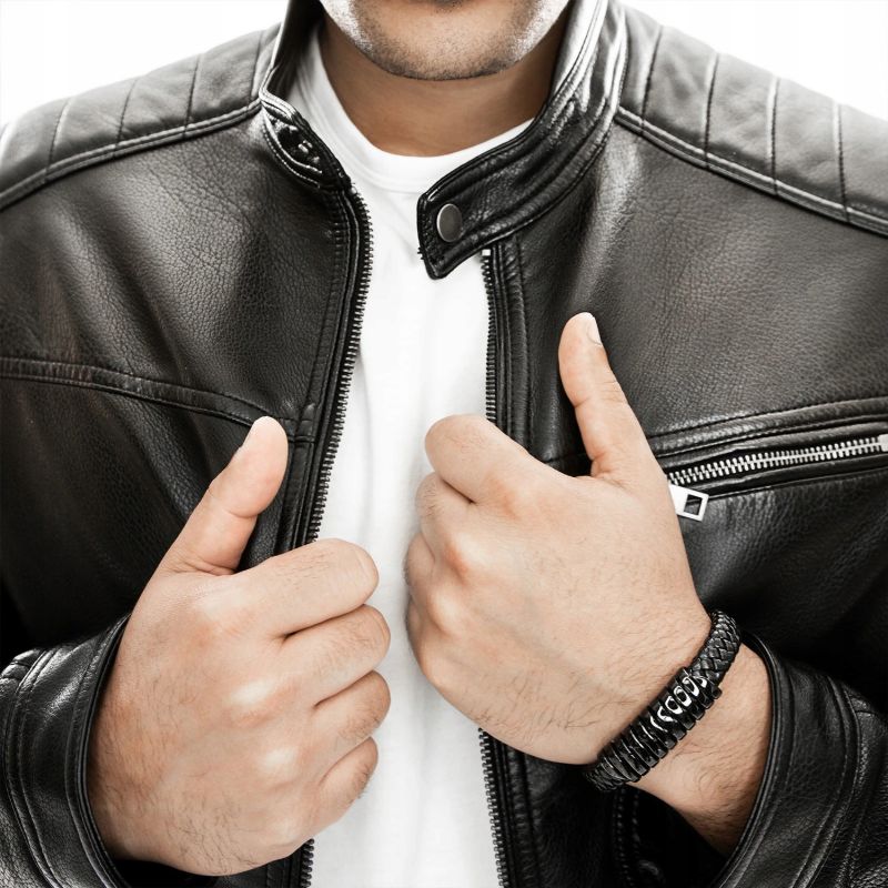 Oferujemy bransoletki męskie ze skóry naturalnej, stali chirurgicznej 316L oraz wytrzymałego sznurka jubilerskiego. Wszystkie materiały są odporne na codzienne użytkowanie, nie uczulają i gwarantują długą trwałość.