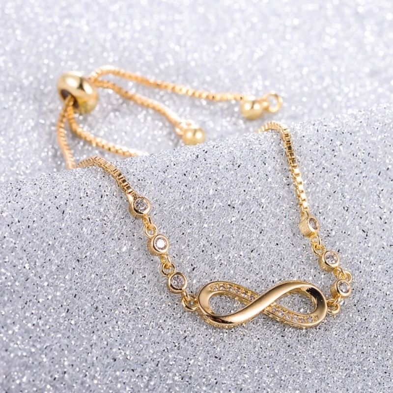 Zachwyć blaskiem i elegancją z bransoletką złotą o subtelnym wzorze nieskończoności, wysadzaną kryształkami. Wykonana z najwyższej jakości stali szlachetnej pokrytej warstwą złota próby 585, bransoletka idealnie sprawdzi się jako prezent lub codzienny dodatek, który podkreśli Twój styl.